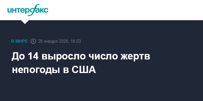 Москва. 26 января. INTERFAX.RU - Продолжающиеся снегопады и сохраняющаяся низкая температура в США привели к гибели не менее 14 человек, сообщает в понедельник телеканал ABC.