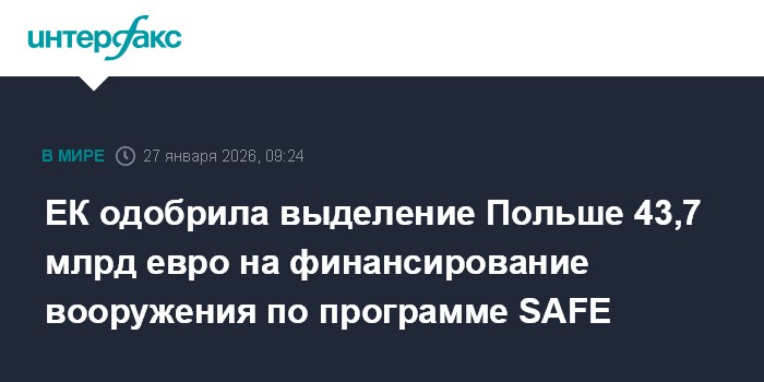 Москва. 27 января. INTERFAX.RU - Европейская комиссия (ЕК) одобрила заявку Польши на финансирование в рамках программы перевооружения ЕС SAFE, сообщил польский вице-премьер, министр национальной обороны Владислав Косиняк-Камыш.