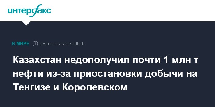 Москва. 28 января. INTERFAX.RU - Казахстан недополучил почти 1 млн тонн нефти из-за приостановки добычи на месторождениях Тенгиз и Королевское, сообщил министр энергетики республики Ерлан Аккенженов.
