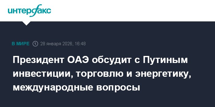 Москва. 28 января. INTERFAX.RU - Президент ОАЭ Мухаммед Бен Заид Аль Нахайян и президент России Владимир Путин 29 января обсудят различные темы в сфере экономики и торговли, передает государственное агентство WAM.