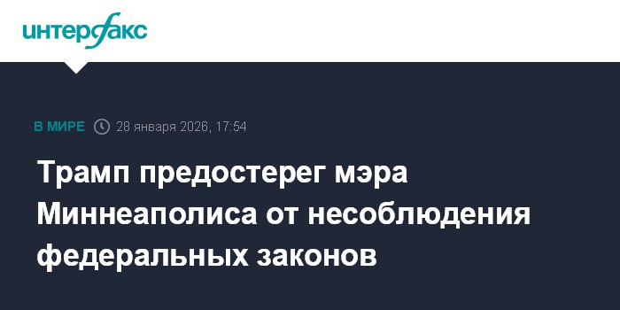 Москва. 28 января. INTERFAX.RU - Президент США Дональд Трамп призвал мэра Миннеаполиса не чинить препятствия исполнению иммиграционных законов на территории этого города.