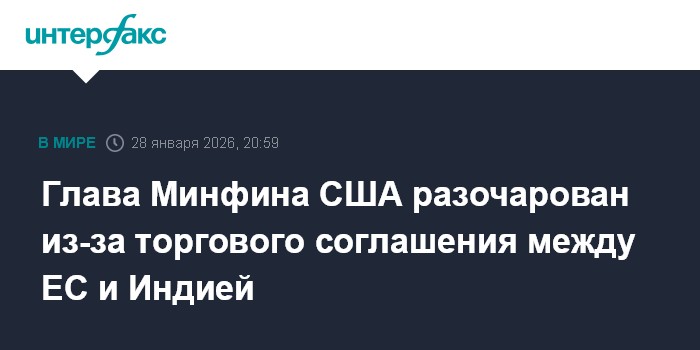 Москва. 28 января. INTERFAX.RU - Министр финансов США Скотт Бессент разочарован в связи с решением Евросоюза заключить торговое соглашение с Индией. Он сказал об этом CNBC News.