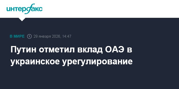 Москва. 29 января. INTERFAX.RU - Президент РФ Владимир Путин отметил вклад ОАЭ в украинское урегулирование и поблагодарил президента этой страны Мухаммеда бен Заида Аль Нахайяна за внимание, уделенное на прошлой неделе российской делегации в Абу-Даби.