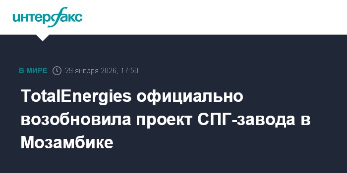 Москва. 29 января. INTERFAX.RU - Глава французской TotalEnergies Патрик Пуянне и президент Мозамбика Даниэль Чапо совместно объявили о полном возобновлении деятельности по проекту Mozambique LNG, сообщила компания.