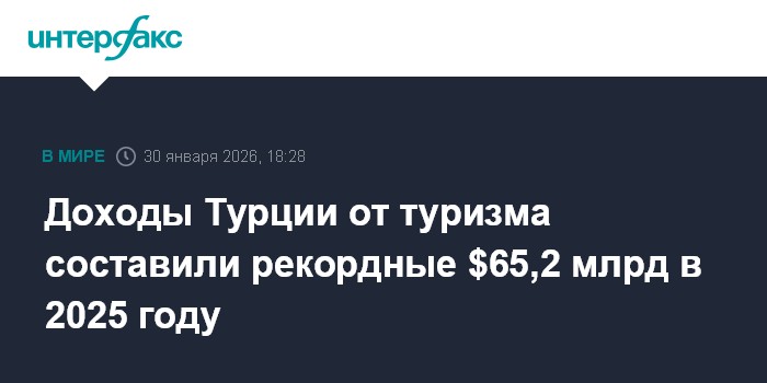 Москва. 30 января. INTERFAX.RU - Туристические доходы Турции за прошлый год составили рекордные $65,2 млрд, это на 6,8% больше, чем годом ранее, в 2026 году планируется увеличить их до $68 млрд, сообщает газета Dunya со ссылкой на министра культуры и туризма республики Мехмета Нури Эрсоя.