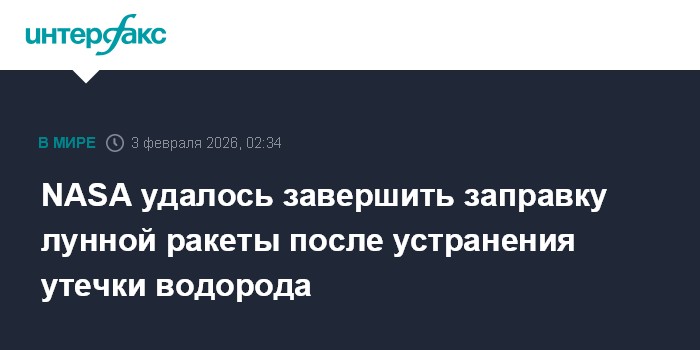 Москва. 3 февраля. INTERFAX.RU - Наземным службам на космодроме во Флориде во вторник удалось завершить заправку жидким водородом основной ступени американской лунной ракеты, приостановленную после обнаружения утечки топлива в ходе генеральной репетиции запуска, сообщает NASA.
