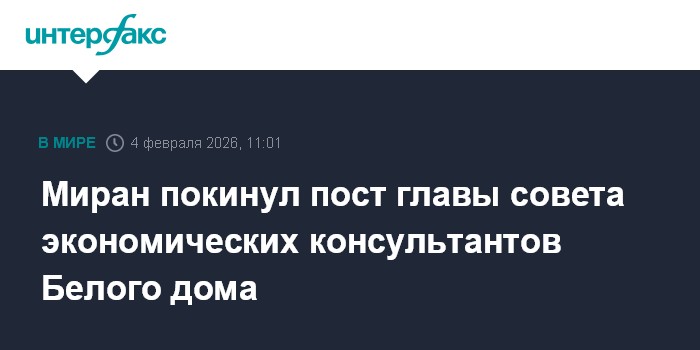 Москва. 4 февраля. INTERFAX.RU - Стивен Миран, занявший пост в совете управляющих Федеральной резервной системы США в сентябре 2025 года, покинул должность главы совета экономических консультантов Белого дома, передает Bloomberg.