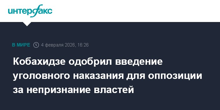 Москва. 4 февраля. INTERFAX.RU - Премьер-министр Грузии Ираклий Кобахидзе поддерживает идею ввести уголовную ответственность для лиц, не признающих легитимность конституционных органов и публично призывающего к их непризнанию. Он сказал об этом журналистам.