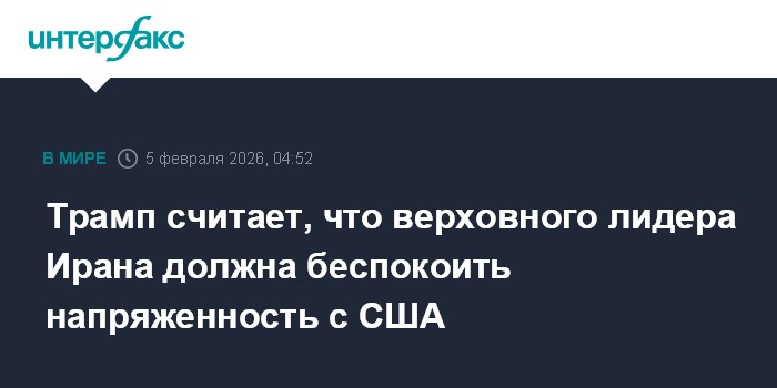 Москва. 5 февраля. INTERFAX.RU - Президент США Дональд Трамп полагает, что верховному лидеру Ирана аятолле Али Хаменеи стоит всерьез беспокоиться в связи с текущей напряженностью между странами.