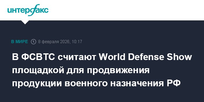 Москва. 8 февраля. INTERFAX.RU - РФ рассматривает открывающуюся в воскресенье в Эр-Рияде выставку World Defense Show-2026 как площадку для продвижения отечественной продукции военного назначения (ПВН), сообщили в Федеральной службе по военно-техническому сотрудничеству (ФСВТС) России.