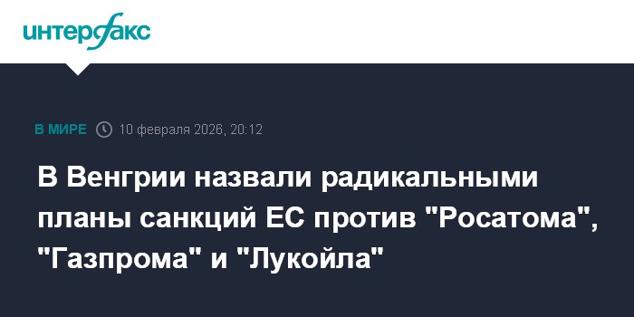Москва. 10 февраля. INTERFAX.RU - ЕС рассматривает возможность включения компаний "Лукойл", "Газпром" и "Росатом" в 20-й пакет санкций в отношении России, сообщил во вторник глава МИД Венгрии Петер Сийярто.