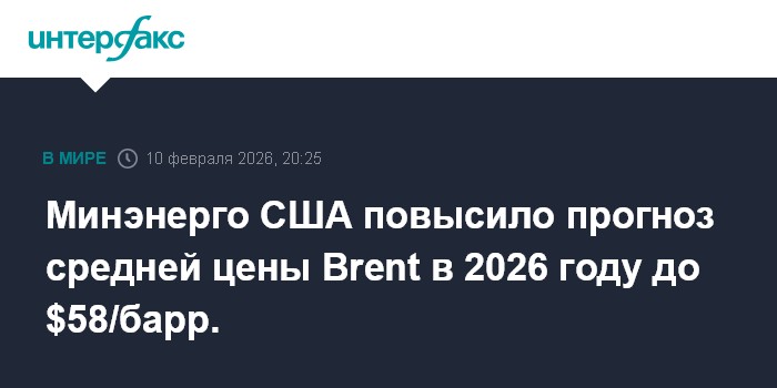 Москва. 10 февраля. INTERFAX.RU - Минэнерго США повысило прогноз цены нефти сорта Brent на 2026 год с $55,87 до $57,69 за баррель, следует из данных ежемесячного прогноза Управления энергетической информации (EIA) ведомства.