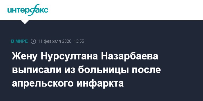 Москва. 11 февраля. INTERFAX.RU - Жену первого президента Казахстана Сару Назарбаеву в январе выписали из больницы после обширного инфаркта миокарда, сообщил советник - пресс-секретарь Нурсултана Назарбаева Айдос Укибай.