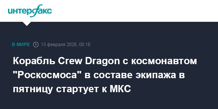 Москва. 13 февраля. INTERFAX.RU - Корабль Crew Dragon с миссией Crew-12 в пятницу стартует к Международной космической станции (МКС), сообщает NASA.