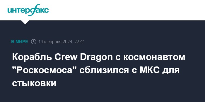 Москва. 14 февраля. INTERFAX.RU - Американский многоразовый космический корабль Crew Dragon компании SpaceX, запущенный накануне, в субботу сблизился с Международной космической станцией (МКС) для проведения стыковки, сообщает NASA.