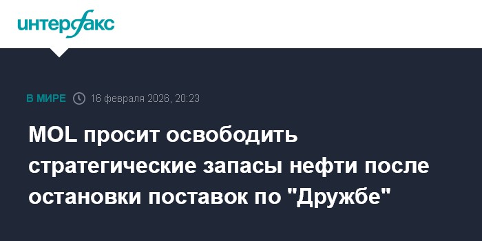 Москва. 16 февраля. INTERFAX.RU - Венгерская нефтегазовая компания MOL обратилась в министерство энергетики Венгрии с просьбой о высвобождении стратегических запасов нефти после того, как поставки нефти по трубопроводу "Дружба" были приостановлены с 27 января 2026 года, сообщила компания.