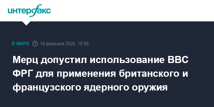 Москва. 18 февраля. INTERFAX.RU - Канцлер ФРГ Фридрих Мерц считает возможным использовать немецкие самолеты для применения французского или британского ядерного оружия, однако выступает против получения Берлином собственных вооружений такого типа, сообщает в среду газета Die Zeit.