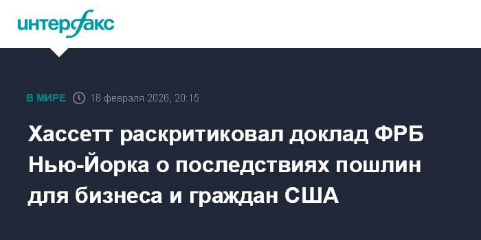 Москва. 18 февраля. INTERFAX.RU - Экономический советник Белого дома Кевин Хассетт раскритиковал недавний доклад Федерального резервного банка (ФРБ) Нью-Йорка, в котором говорится, что основная часть нагрузки, вызванная повышением пошлин на импорт в США в 2025 году, легла на плечи американских компаний и потребителей.