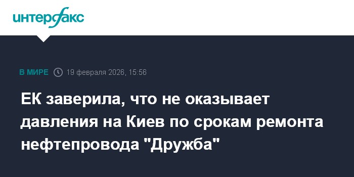 Москва. 19 февраля. INTERFAX.RU - Еврокомиссия (ЕК) не устанавливает для Киева сроков ремонта нефтепровода "Дружба" и не оказывает в этой связи давления на Украину. Об этом заявила официальный представитель ЕК Анна-Кайса Итконен.