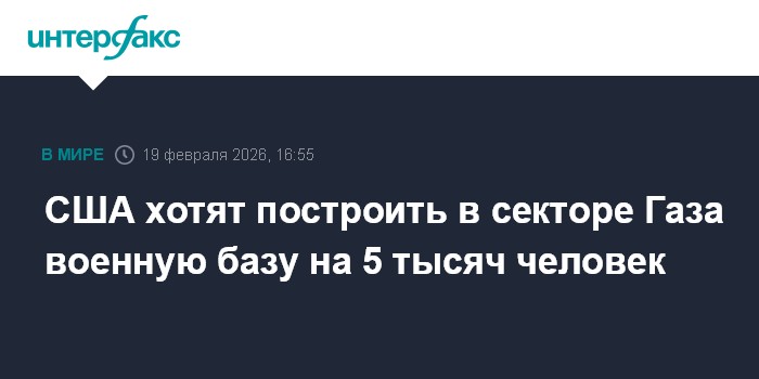 Москва. 19 февраля. INTERFAX.RU - Власти США планируют построить в секторе Газа военную базу для международных стабилизационных сил, которые, как предполагается, будут действовать под эгидой Совета мира, сообщает в четверг The Guardian со ссылкой на источники.
