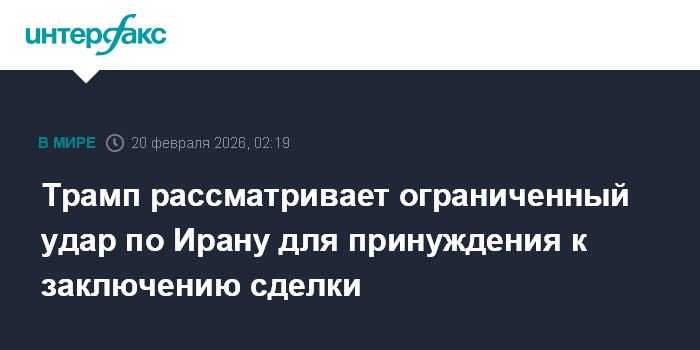 Москва. 20 февраля. INTERFAX.RU - Президент США Дональд Трамп рассматривает различные варианты действий в отношении Ирана, в числе которых возможность нанесения ограниченного удара, чтобы заставить Тегеран заключить ядерную сделку, пишет The Wall Street Journal.