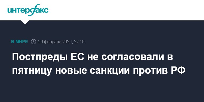Москва. 20 февраля. INTERFAX.RU - Постпреды стран ЕС в ходе встречи в пятницу не смогли договориться о новом санкционном пакете против России, сообщают европейские СМИ.