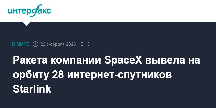Москва. 22 февраля. INTERFAX.RU - Ракета-носитель Falcon 9 в воскресенье вывела на орбиту партию из 28 мини-спутников для пополнения орбитальной группировки глобальной сети интернет-покрытия системы Starlink, сообщила компания-разработчик SpaceX.