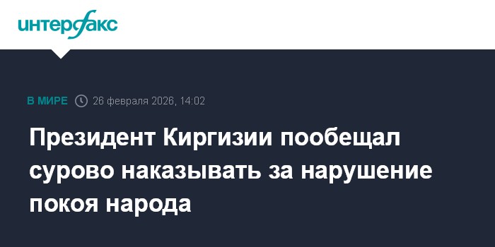 Москва. 26 февраля. INTERFAX.RU - Президент Киргизии Садыр Жапаров пообещал суровое наказание для тех, кто нарушит покой народа. Он сказал об этом агентству "Кабар".