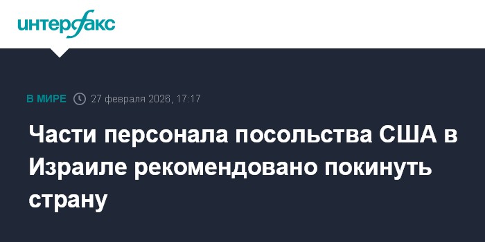 Москва. 27 февраля. INTERFAX.RU - Американское посольство в Иерусалиме рекомендовало сотрудникам, не выполняющим ключевые функции, покинуть Израиль в ближайшее время, сообщает в пятницу The Guardian.