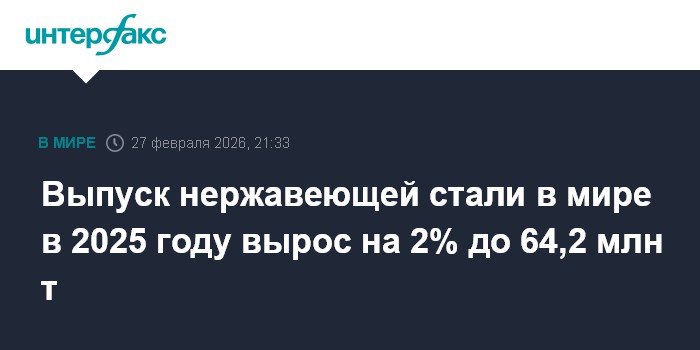 Москва. 27 февраля. INTERFAX.RU - Мировое производство нержавеющей стали в 2025 году выросло на 2,1%, до 64,2 млн тонн. Об этом сообщила Всемирная ассоциация нержавеющей стали (World Stainless Association, ранее - International Stainless Steel Forum, ISSF).