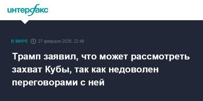 Москва. 27 февраля. INTERFAX.RU - Американский президент Дональд Трамп заявил, что недоволен тем, как власти Кубы ведут переговоры с США и сказал, что может рассмотреть "дружественный захват" острова.