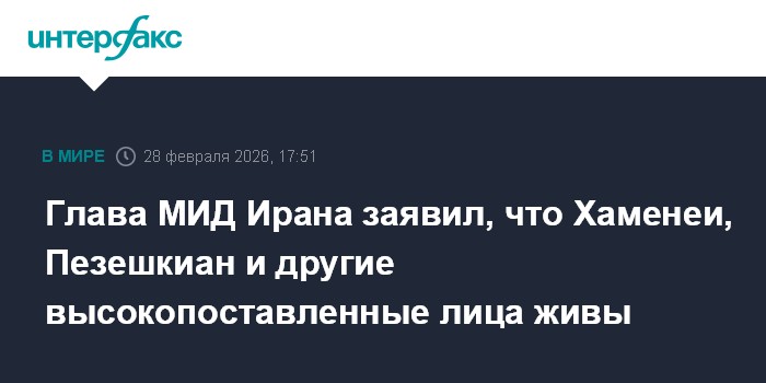 Москва. 28 февраля. INTERFAX.RU - Верховный лидер Ирана Али Хаменеи и президент Ирана Масуд Пезешкиан живы после ударов США и Израиля по Ирану, заявил глава иранского МИД Аббас Аракчи.