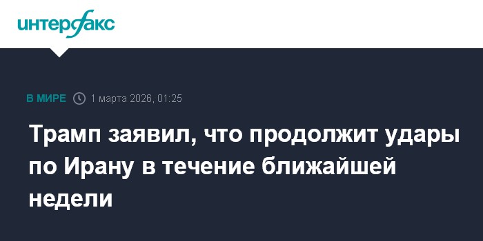 Москва. 1 марта. INTERFAX.RU - Удары США по Ирану продолжатся в течение еще нескольких дней, заявил американский президент Дональд Трамп.