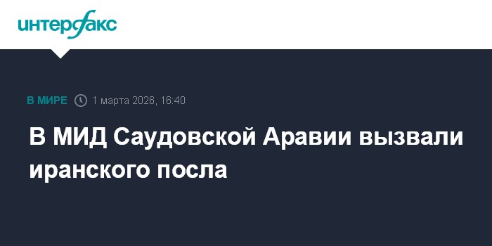 Москва. 1 марта. INTERFAX.RU - Иранский посол в Саудовской Аравии в воскресенье вызван в МИД королевства в связи с обстрелами саудовской территории и территорий стран Персидского залива, предпринятым в ответ на американо-израильскую операцию против Ирана.