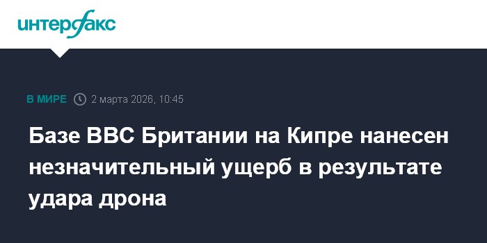 Москва. 2 марта. INTERFAX.RU - Власти Кипра в понедельник сообщили о небольшом ущербе британской военной авиабазе "Акротири", нанесенном атакой беспилотника, передает агентство ЭФЭ со ссылкой на представителя кипрского правительства Константиноса Летимбиотиса.