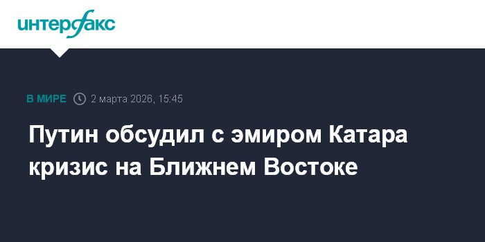 Москва. 2 марта. INTERFAX.RU - В ходе телефонного разговора президента РФ Владимира Путина с эмиром Катара Тамимом Бен Хамадом Аль Тани основное внимание уделено острому кризису на Ближнем Востоке, вызванному американо-израильской агрессией против Ирана, сообщила в понедельник пресс-служба главы российского государства.