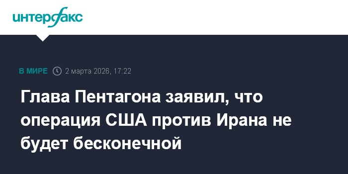 Москва. 2 марта. INTERFAX.RU - Операция США против Ирана является четкой, разрушительной, не будет бесконечной, заявил в понедельник министр войны США Пит Хегсет.