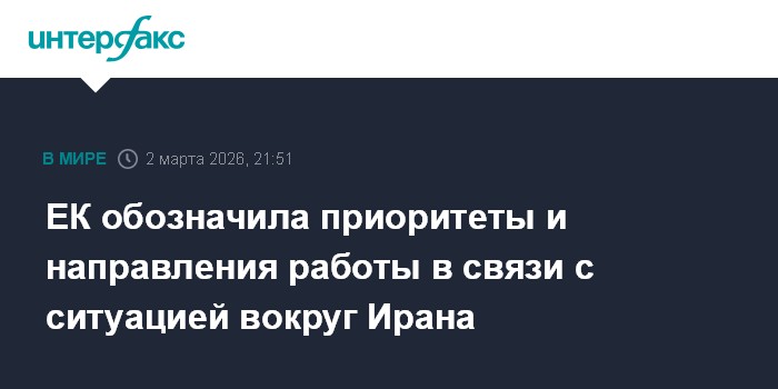 Москва. 2 марта. INTERFAX.RU - Еврокомиссия (ЕК) в связи с ситуацией в Иране и на Ближнем Востоке определяет для себя два приоритета: поддержку государств-членов и защиту граждан ЕС от негативных последствий развивающихся событий, говорится в коммюнике ЕК.