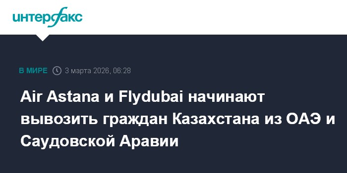 Москва. 3 марта. INTERFAX.RU - Министерство транспорта Казахстана сообщило о начале вывозных рейсов из Саудовской Аравии и ОАЭ.