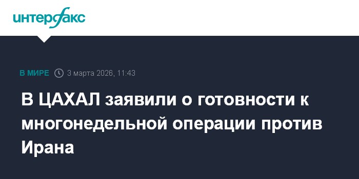 Москва. 3 марта. INTERFAX.RU - Израильские военные готовы к тому, что кампания против Ирана будет длиться несколько недель, сообщают во вторник западные СМИ со ссылкой на представителя Армии обороны Израиля (ЦАХАЛ) Надава Шошани.
