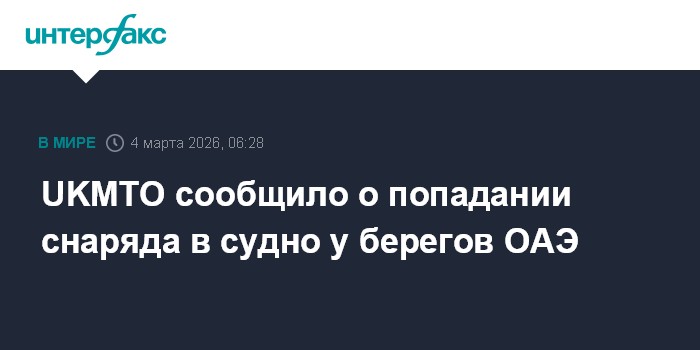 Москва. 4 марта. INTERFAX.RU - Управление морских торговых операций Соединенного Королевства (UKMTO), которое следит за безопасностью на море, сообщило об инциденте с судном у берегов ОАЭ.