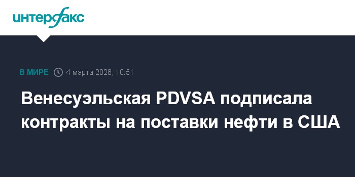 Москва. 4 марта. INTERFAX.RU - Государственная Petroleos de Venezuela S.A. (PDVSA) подписала контракты на поставку нефти и нефтепродуктов с трейдерами, которые занимаются их сбытом на рынке США, сообщает компания в официальном телеграм-канале.