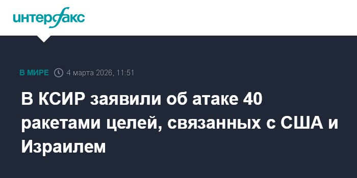 Москва. 4 марта. INTERFAX.RU - В Корпусе стражей Исламской революции (КСИР) заявили, что атаковали 40 ракетами цели, связанные с США и Израилем, сообщает в среду Al Arabiya.