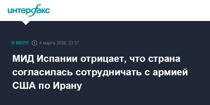 Москва. 4 марта. INTERFAX.RU - Испания не меняла позицию по поводу американской и израильской военной операции против Ирана и не соглашалась на сотрудничество с ВС США, заявил в среду вечером глава испанского МИД Хосе Мануэль Альбарес.