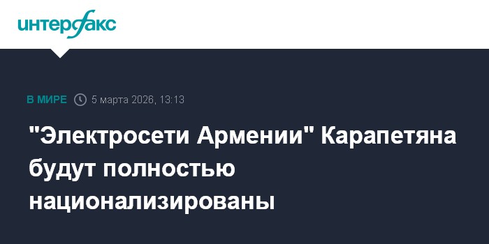 Москва. 5 марта. INTERFAX.RU - Правительство Армении приняло решение о полной национализации принадлежащей бизнесмену Самвелу Карапетяну компании "Электрические сети Армении" (ЭСА), сообщил на брифинге премьер-министр страны Никол Пашинян.
