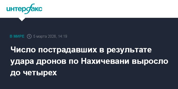 Москва. 5 марта. INTERFAX.RU - В результате атаки Ирана беспилотниками на Нахичеванскую Автономную Республику Азербайджана в медицинские учреждения обратились четыре человека, передают азербайджанские СМИ со ссылкой на больницу Нахичевани.