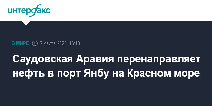 Москва. 5 марта. INTERFAX.RU - Саудовская Аравия перенаправляет миллионы баррелей нефти в порт Янбу на Красном море, чтобы продолжить поставки сырья на мировой рынок в условиях блокировки ключевого экспортного маршрута через Ормузский пролив.