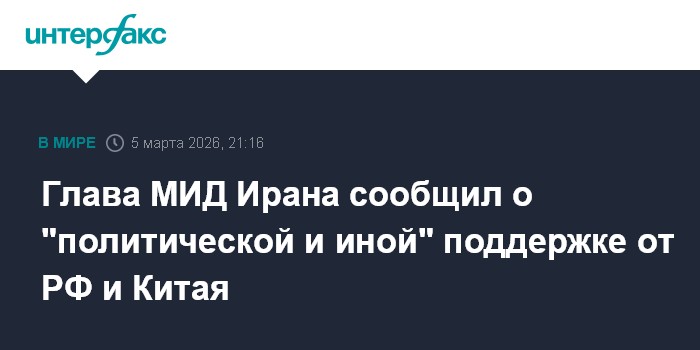Москва. 5 марта. INTERFAX.RU - Иран в условиях конфликта с США и Израилем получает различную поддержку со стороны России и Китая, заявил глава МИД Ирана Аббас Аракчи в четверг в интервью телеканалу NBC News.