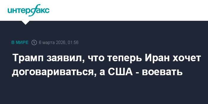 Москва. 6 марта. INTERFAX.RU - На фоне нынешней эскалации ситуации Тегеран хочет соглашения, но он опоздал, потому что Вашингтон хочет воевать, заявил президент США Дональд Трамп.