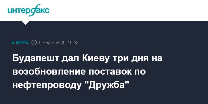 Москва. 6 марта. INTERFAX.RU - Венгерское правительство дало Украине три дня на восстановление транзита российской нефти по трубопроводу "Дружба" и на допуск инспекторов. Об этом сообщил государственный секретарь при министерстве энергетики Венгрии Габор Чепек.